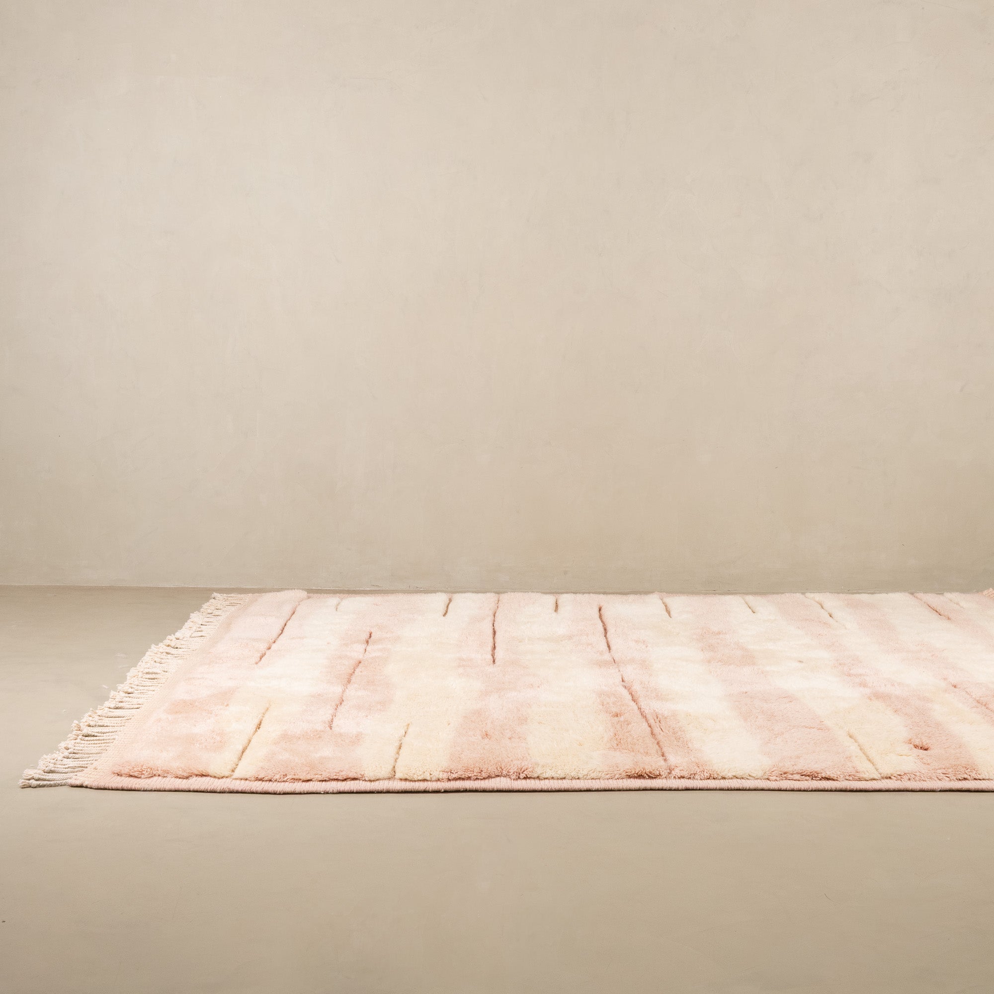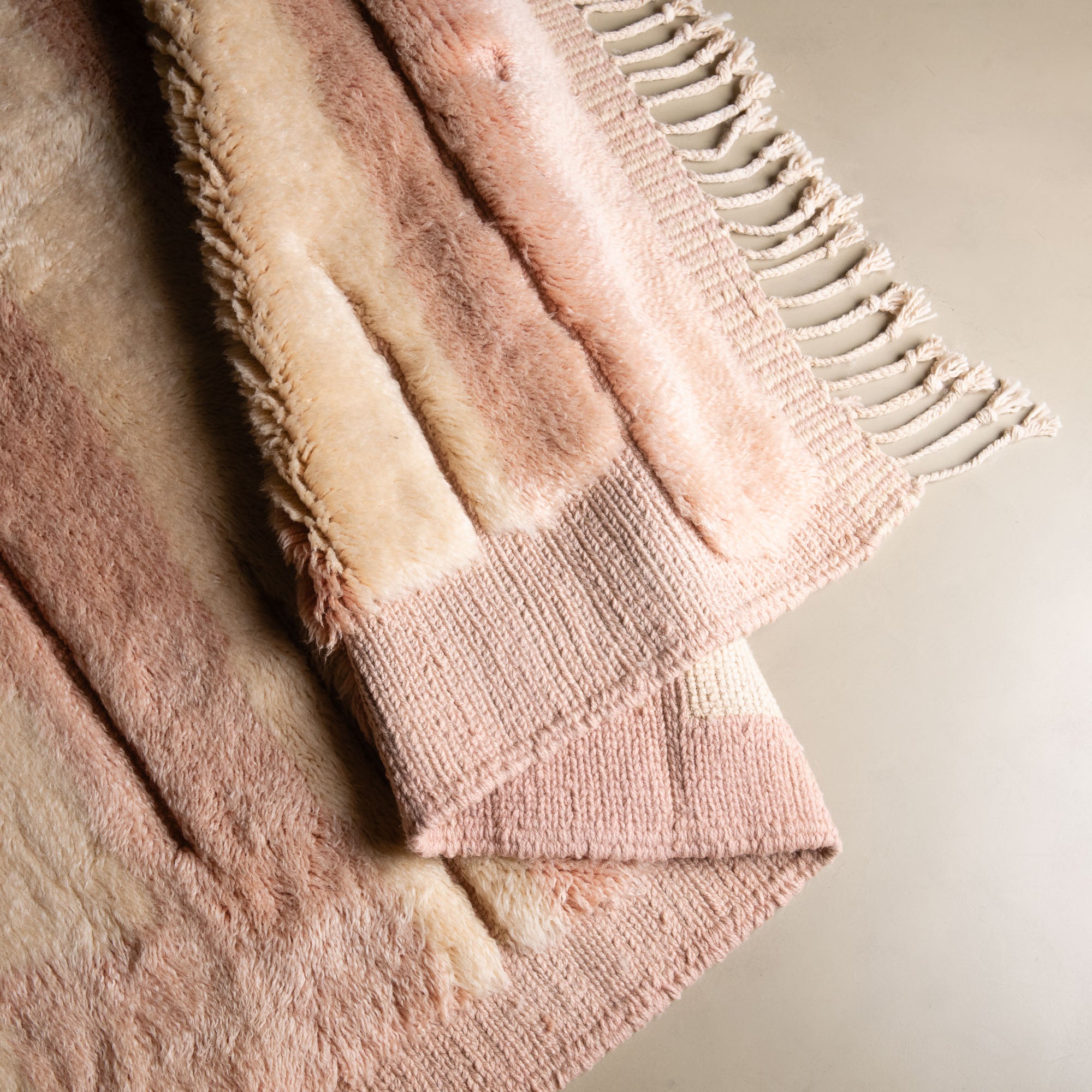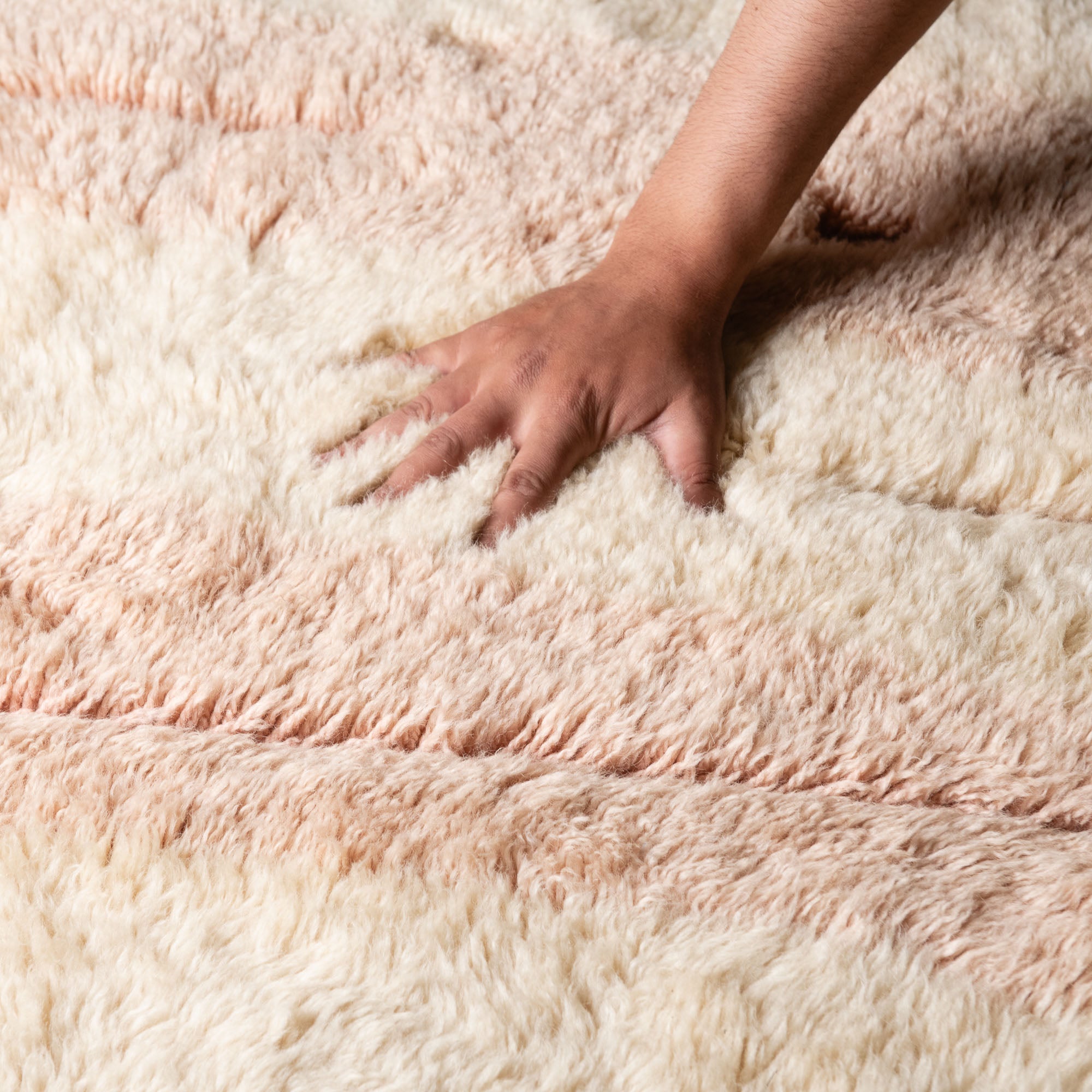 Chaque tapis est tissé nœud par nœud, puis lavé et séché à l'air libre sous le ciel serein du Maroc.