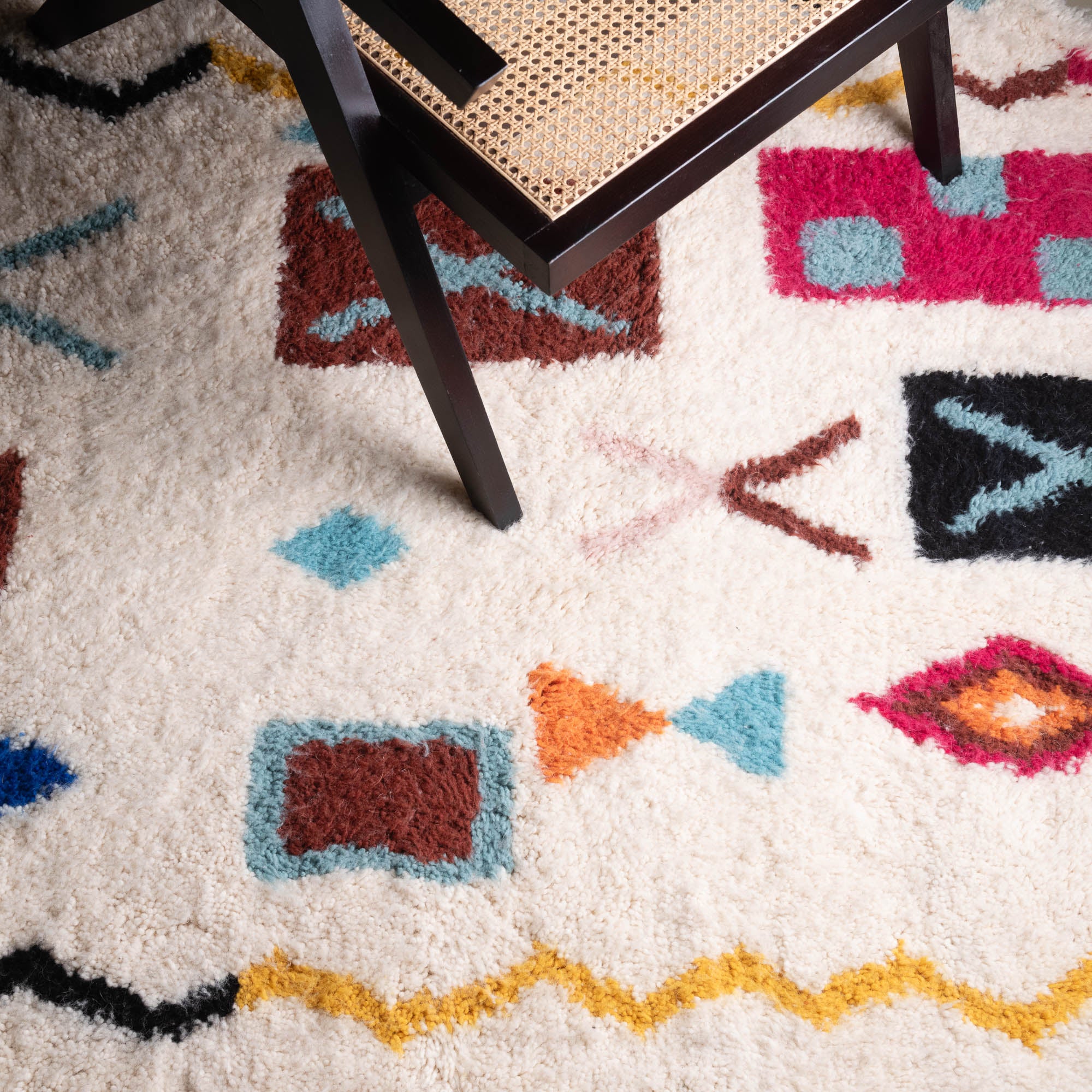 Chaque tapis est tissé nœud par nœud, puis lavé et séché à l'air libre sous le ciel serein du Maroc.